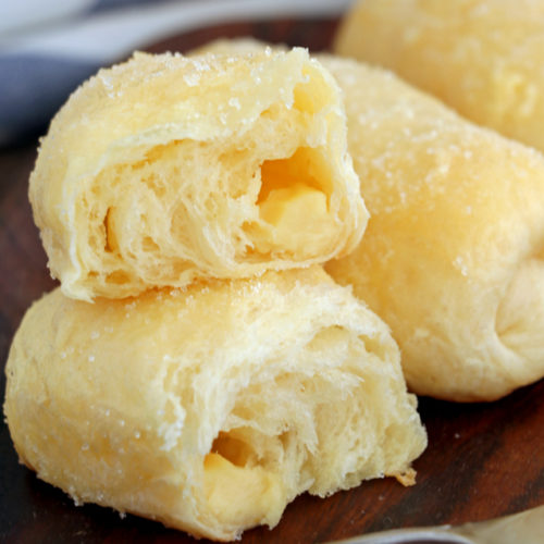 The Filipino Cheese Rolls are basically bread stuffed with cheese. After baking, the rolls are then brushed with softened butter and generously sprinkled or rolled in sugar.