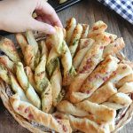 - Twist each cut 3-4 times. Transfer each twisted pastry to the prepared baking sheet. Bake on the middle rack for 15-20 minutes or until golden and crisp. Let the sticks cool down a bit and remove from the baking sheet. Transfer to bread basket or serving dish.