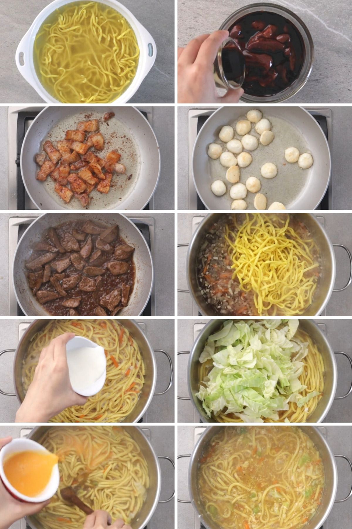 - 500 grams fresh large lomi noodlesSoak lomi noodles in water for 5 minutes. Wash and drain twice.