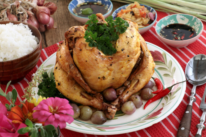 For this recipe, I marinated the chicken with a soy sauce mixture and stuffed it with lemongrass, shallots, and garlic to make it more flavorful! I love how the lemongrass makes the dish even more aromatic and gives it a citrusy flavor! This dish pairs great with steaming white rice or garlic fried rice with some Atchara on the side.