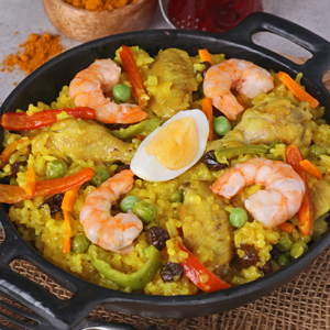 Arroz Valenciana or Arroz ala Valenciana is a Visayan adaptation of the famous Spanish paella. While Paella uses round ground rice and meat stock, this dish uses glutinous or sticky rice and coconut milk instead. It is also characterized by using turmeric (luyang dilaw), chicken, and chorizo de Bilbao.