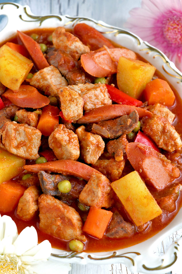 This traditional Filipino dish is different from the Mexican Menudo. The Mexican version is soup-based, it is not a stew. They also use tripe and chilies as their main ingredient while our version uses sliced pork meat and liver. Common vegetables like potatoes, bell pepper, and carrots are used. Sometimes green peas and raisins And of course, let's not forget - the hotdog!