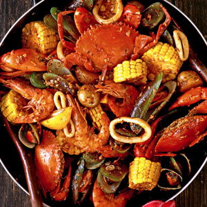 A delicious concoction of crabs, shrimp, mussels, and squid rings plus sweet corn and baby potatoes coated with a finger-lickin' good Cajun seasoning! It's the ultimate summer dish full of bold and vibrant flavors. It's easy to make too! Just prep the seafood, bring them to a boil with the veggies, saute, season, and serve.