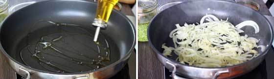 - Meanwhile, in a large skillet over medium heat, add olive oil. Saute onion and garlic until translucent and aromatic.
