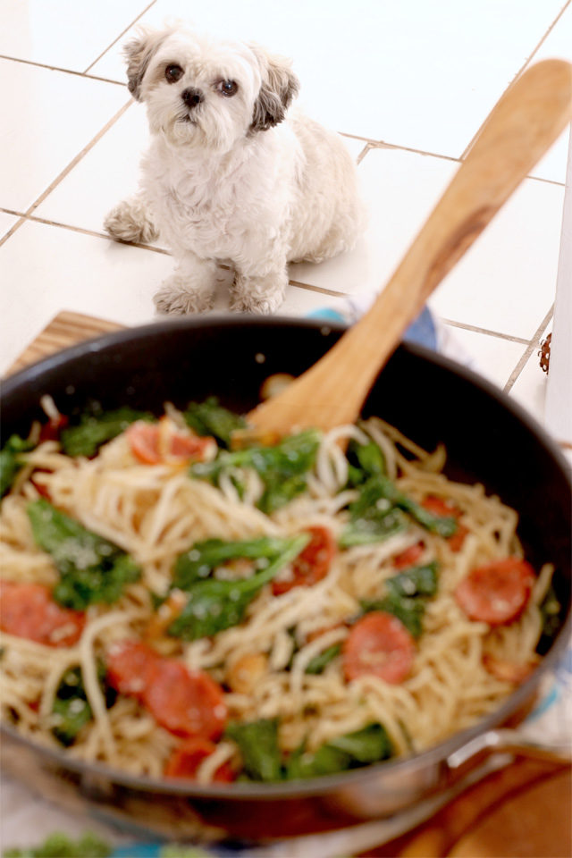 Look who is also looking interested? Sietema, our picky-eater of a furball seems to be curious about our Kale Pasta, she must be wondering what is up there that is smelling so delicious.