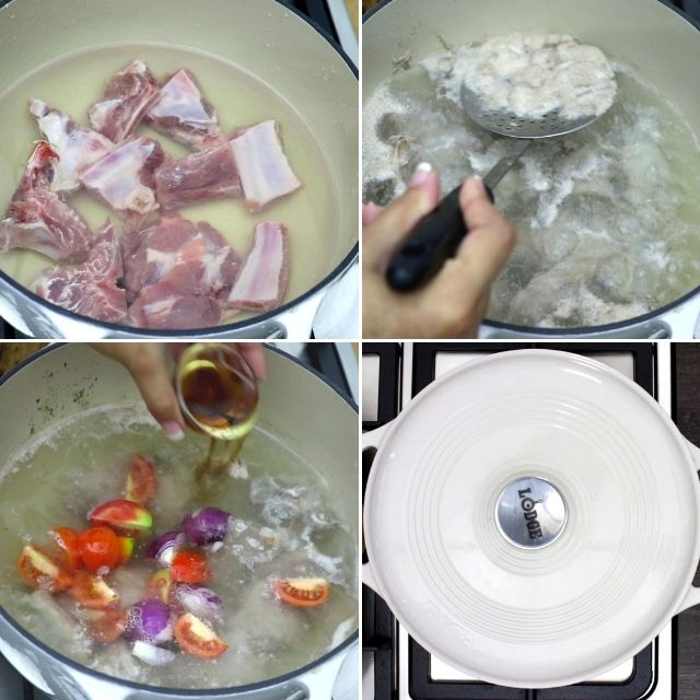 - Add the red onion, tomatoes and fish sauce. Once it starts to boil again, cover the pot with the lid and lower the temperature to low. Let it simmer until pork becomes tender.