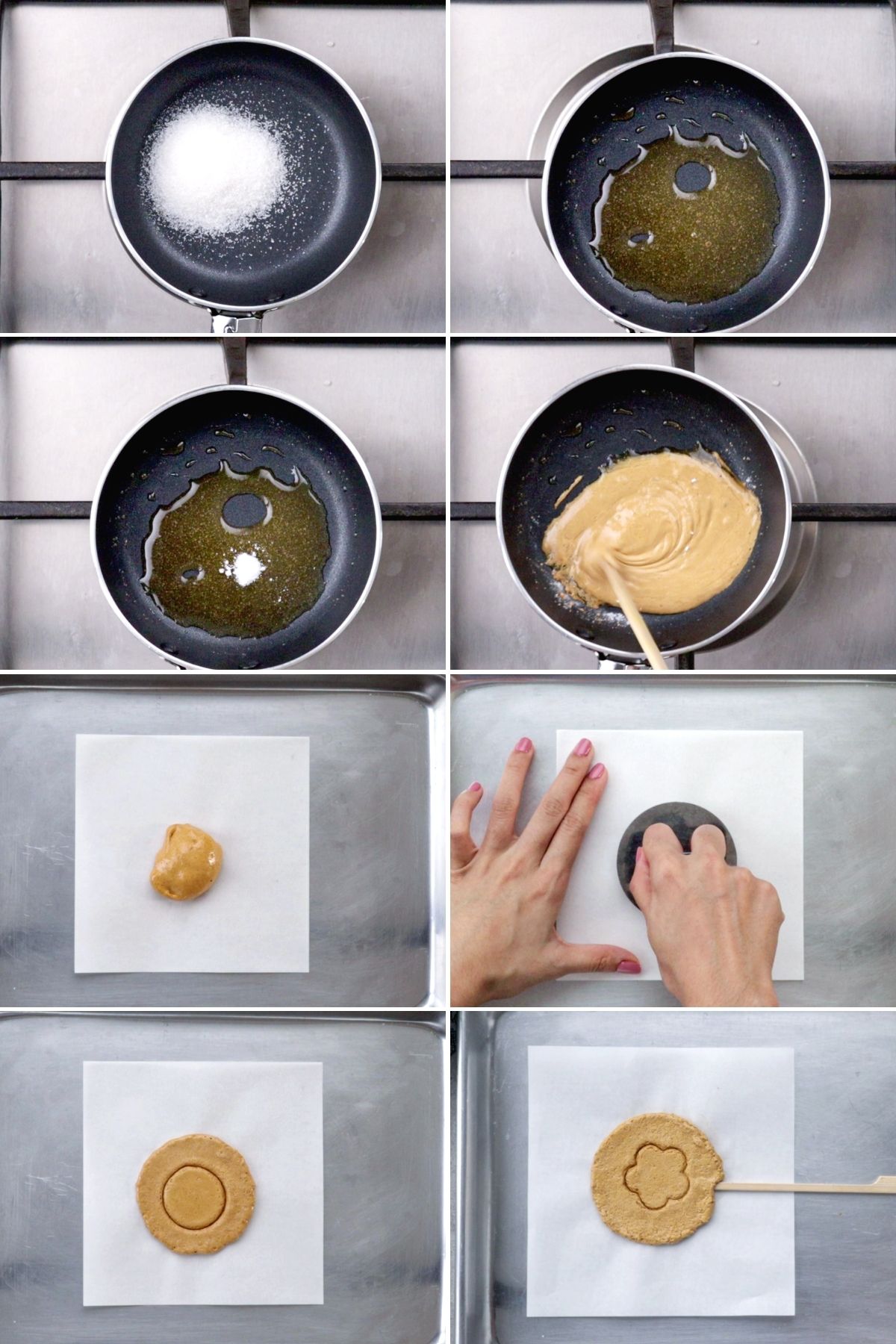 - Let the dalgona mixture cool a bit before pressing it into shape. If it is still warm when you press it, it will simply stick and create a mess.